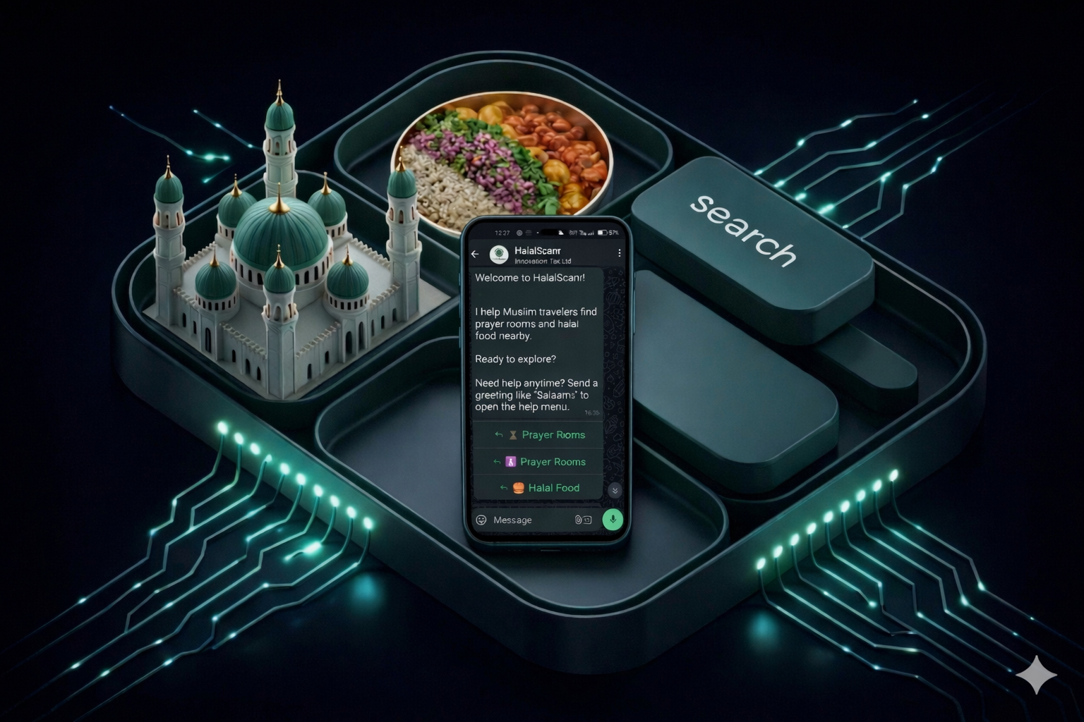 A one-tap initialization that briefs you on your immediate surroundings the moment you land. HalalScanr combines your GPS coordinates with Google Maps Platform data using Google Search Grounding and Real-Time Verification to build a personalized Safe-Arrival briefing delivered instantly via WhatsApp.